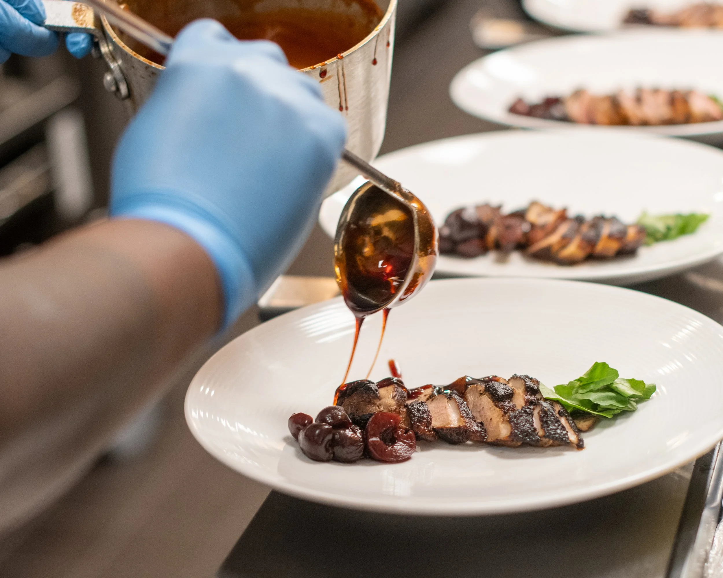 Pan-seared duck breast brushed with a cherry pomegranate glaze, paired with marinated cherries and watercress.