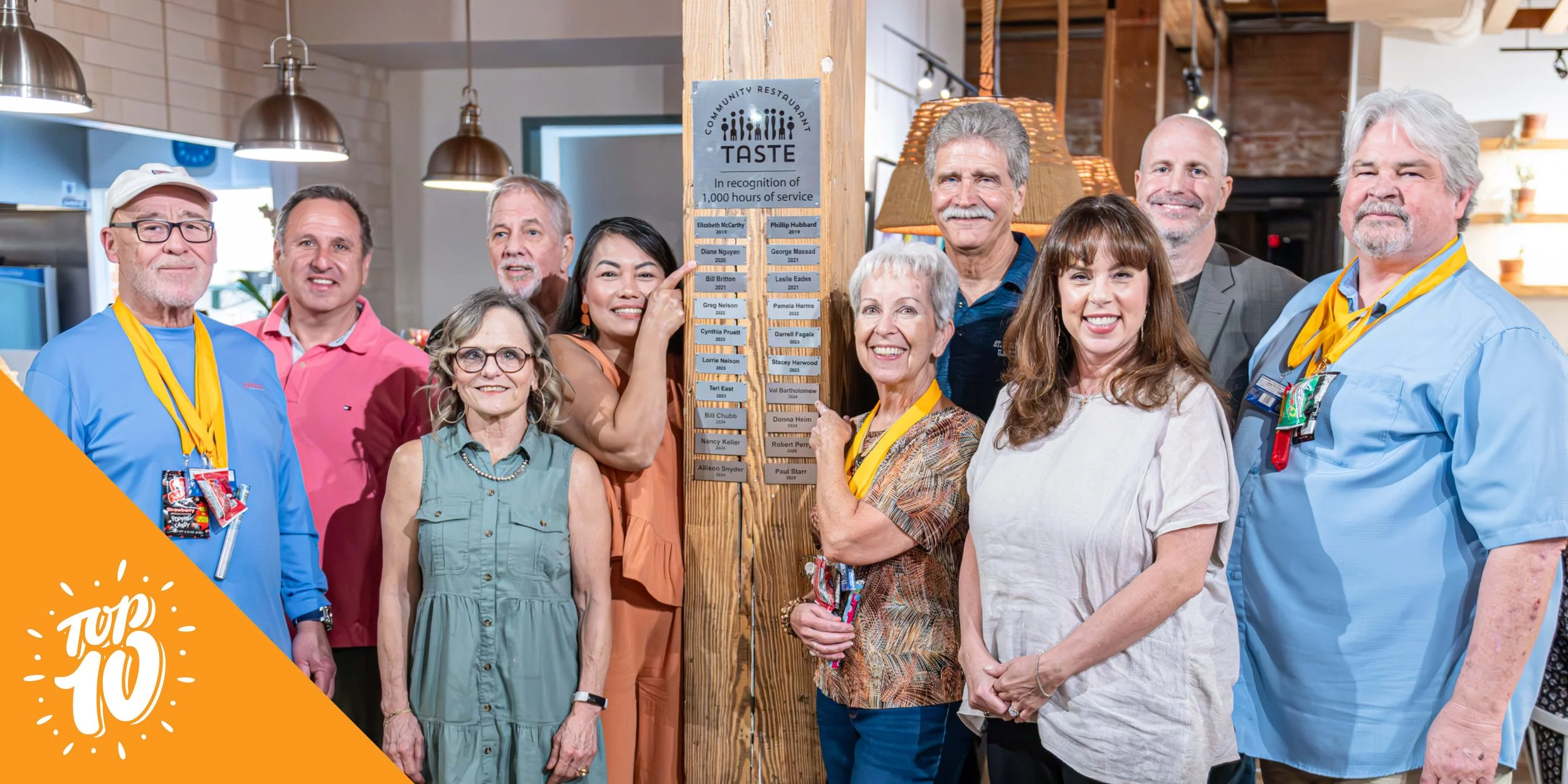 80% of the team at Taste Community Restaurant are volunteers who do everything in the restaurant. Volunteers greet guests at the door and help them find a seat, take orders and pour drinks, and chop, prepare, and plate food to order. This year, we added seven Taste Buds to our Volunteer Pillar at Taste Community Restaurant in Fort Worth. Our Volunteer Pillar recognizes volunteers who have served 1,000 hours at Taste Community Restaurant helping to feed, educate, and serve our community.